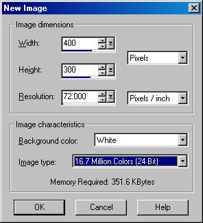This selection will open the window at right: Be sure the units window shows pixels, and choose the width and height you desire. Smaller images load faster. Resolution settings are unimportant for web use. I usually choose "White" as my background color. Choosing 16.7 Million colors for the Image type gives you the most flexibility. Click "OK" when finished. |
